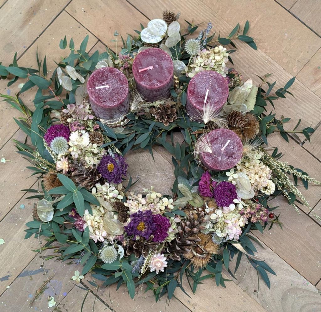 Manchmal fällt es uns schwer, in Weihnachtsstimmung zu kommen. Aber dieser Workshop wird Dich mit dem Duft frischer Tannenzweige, Eukalyptus und getrockneten Blüten abholen, auf- und durchatmen lassen und Dein Herz zum Lächeln bringen.